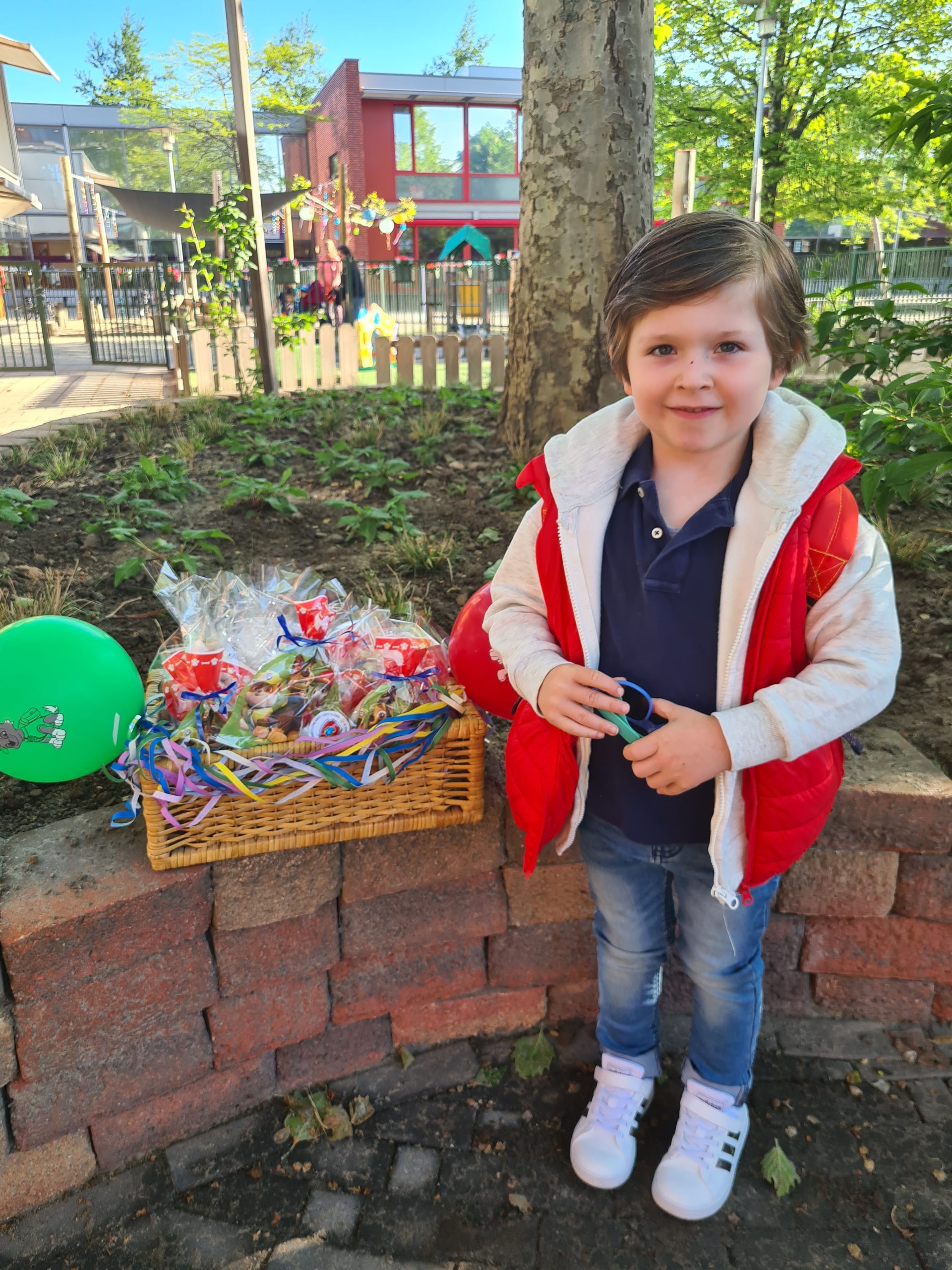 Uiteraard nog even poseren met zijn traktatie. Het was een beetje een makkelijke en snelle traktatie.. hahah maar acht het kind merkt er niets van en vond het een super traktatie. 🙂