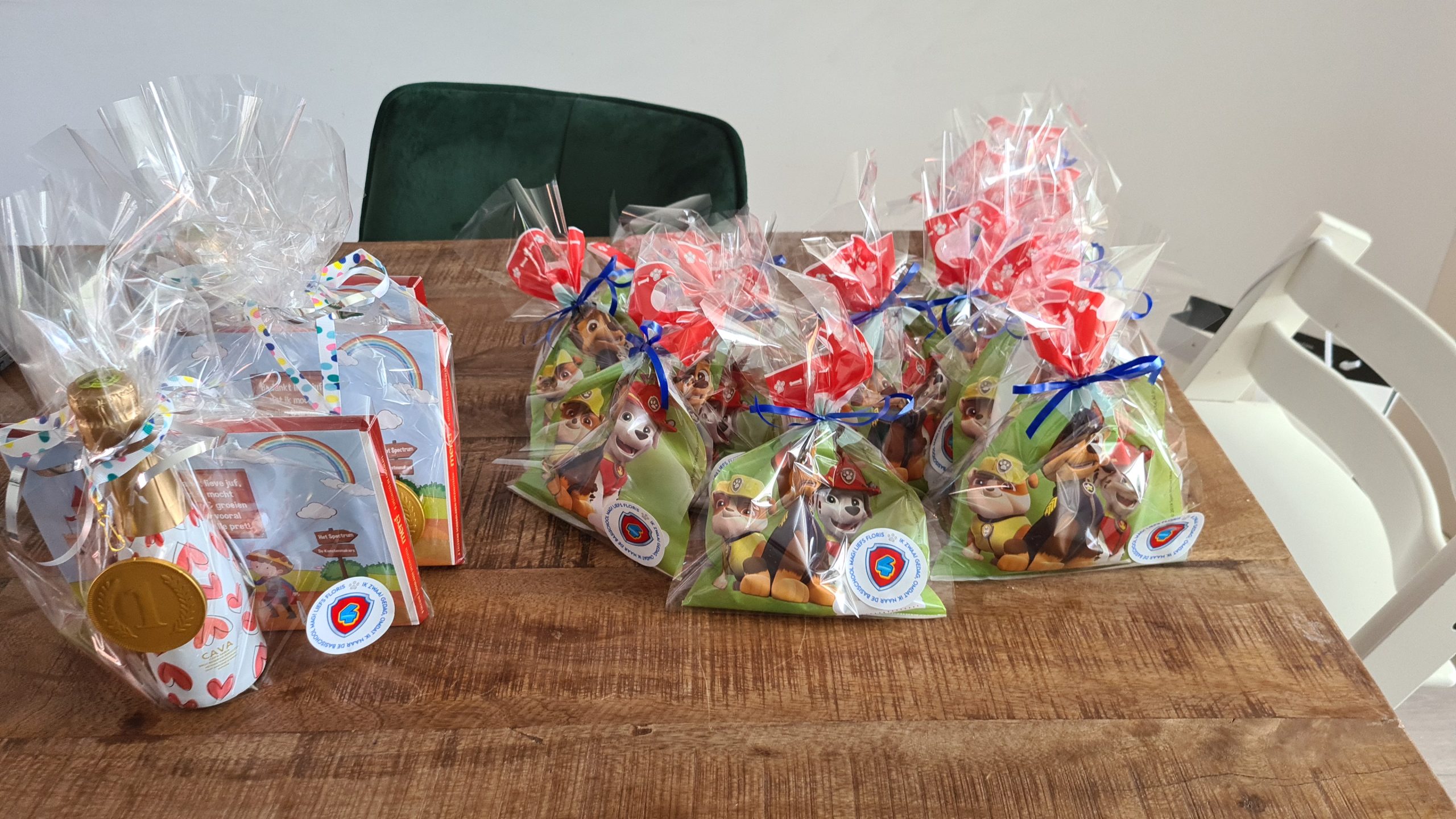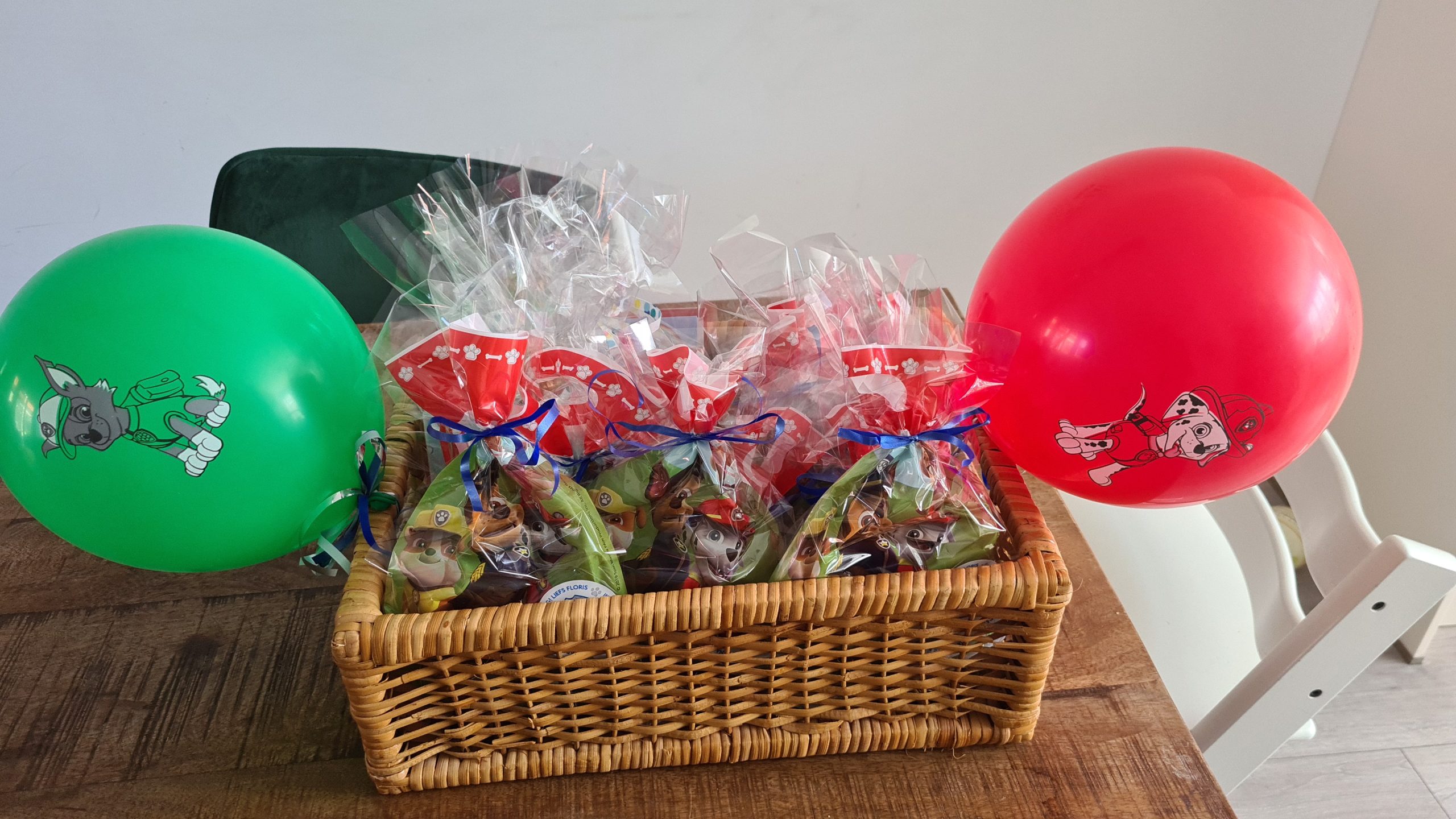 De uitdeelzakjes deed ik in een mand met wat Paw Patrol ballonn eraan, de ballonnen had ik ruim op tijd bij Aliexpress gekocht.