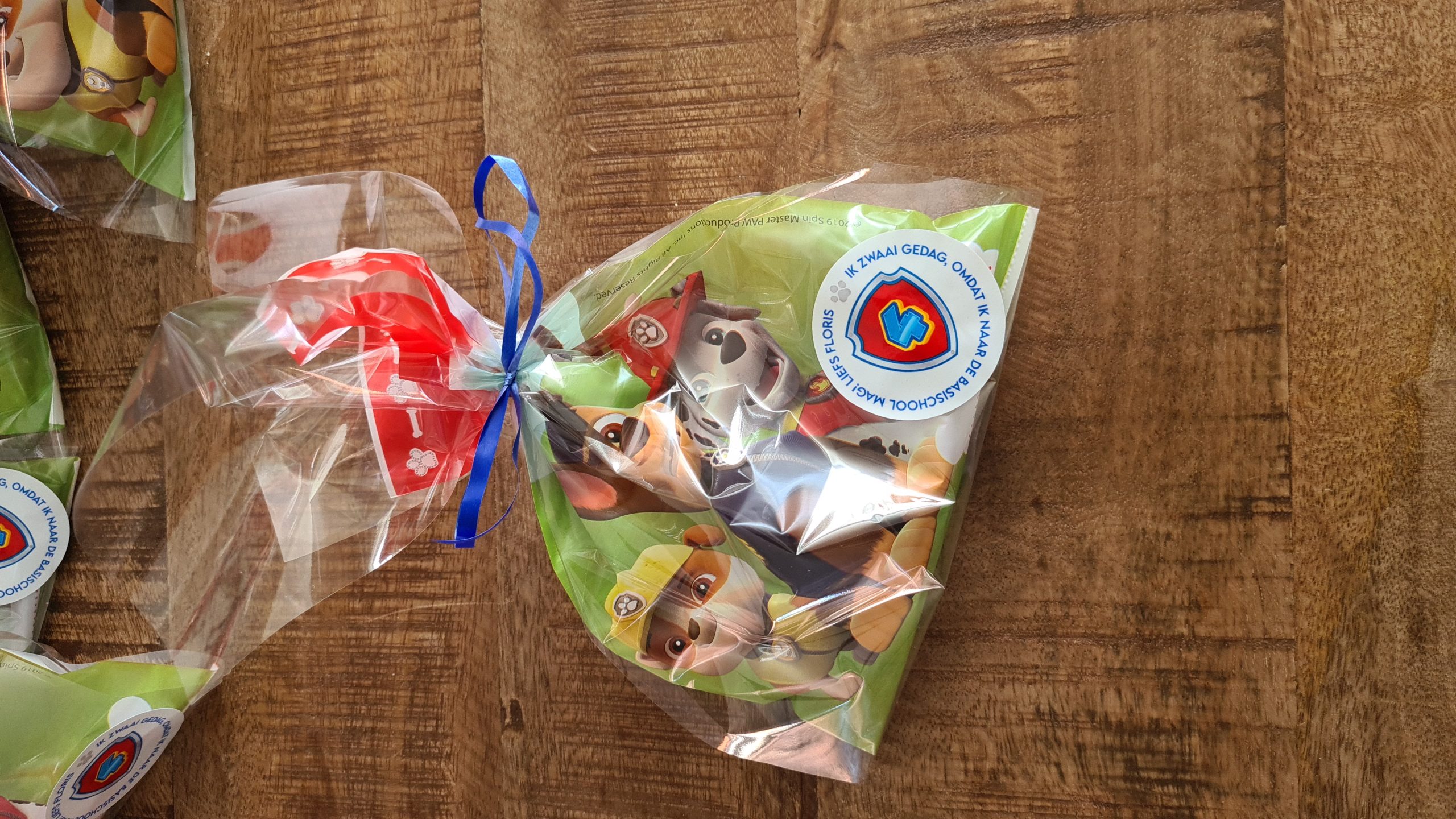 Omdat dit de 2de keer trakteren was, we hadden ook al op het kdv getrakteerd. Heb ik het mezelf iets makkelijker gemaakt. Flor zijn thema dit jaar was Paw Patrol. Ik heb een uideel zakje gevuld met wat snoep en een speeltje. Dit feestelijk in gepakt in doorzichtige folie. Alleen het zakje geven voelde voor mijn gevel wat karig. Ik heb een sticker gemaakt met de 4 erop, in Paw Patrol stijl en de tekst Ik zwaai gedag omdat ik naar de basisschool mag.